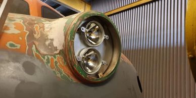 The headlight assembly has been stripped down and cleaned, lights tested. Just need to work out what colour the backing plate should be now.