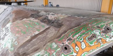 · Body prep: Sanding, sanding, sanding, yes more sanding has been undertaken, now that welding has been completed on the roof, our trusty (thinks he knows what he is doing) panel beater, or as they call him, “bog boy”, can get back into working on the nose and cab roof, there is still heaps of work required to do here. Any help from a pro panel beater would be greatly appreciated … anyone, anyone, please help me! But at least with a spray of undercoat the area has some form of uniformity to it.